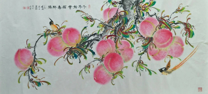 近些年来油画的超写实主义画派可谓在油画历史长河中的新高度,各个国家的代表人物之作品无不价格斐然。比如中国的冷军老师,作品可谓天价。在中国画发展历程中,岭南画派“折衷中西、融会古今”的技法口号成为中国画发展中大胆的尝试,大胆融会传统绘画,又借鉴日本画、西洋画,重视透视和立体感,设色大胆等表现手法。或许可能成为把中国画带到一个新高度的画派。代表名家有徐悲鸿、张大千、傅抱石等。因此在此刻将西洋画元素融入中国画作品里,不算为创举。但是将超写实主义画派的理念、岭南画派的融合精神、当今社会文化中缺失的孝道和睦集大成聚焦在一幅作品之中,发出强有力的震撼佳作就是崔真硕先生的中国寿桃画作品。