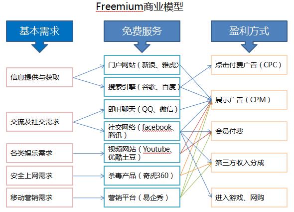 用免费的产品和服务满足用户的基本需求(信息获取、社交、娱乐、营销等),成为互联网流量入口,在此基础上通过展示广告、付费服务、第三方分成等获取收益,这就是Freemium的精髓。
